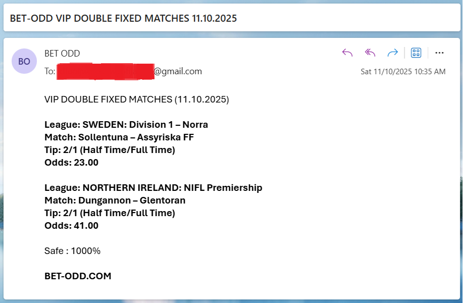 Welcome to the BET-ODD company, which offers you a real opportunity to earn money with fixed matches. We and our team are completely independent. We get information about fixed matches from: Football Clubs, Suspended Players, Injury Players, Financial Status in Clubs, Forms, Selling Players, Mutual Agreement Between Clubs, Strong Information. With us, fixed matches no chance to mistake. If you make a mistake, you get your money back or we give you the next fixed games for free. We guarantee your victory. We specialize in the gambling industry, which means we can offer our customers an exceptional and good earnings offer with our fixed matches.