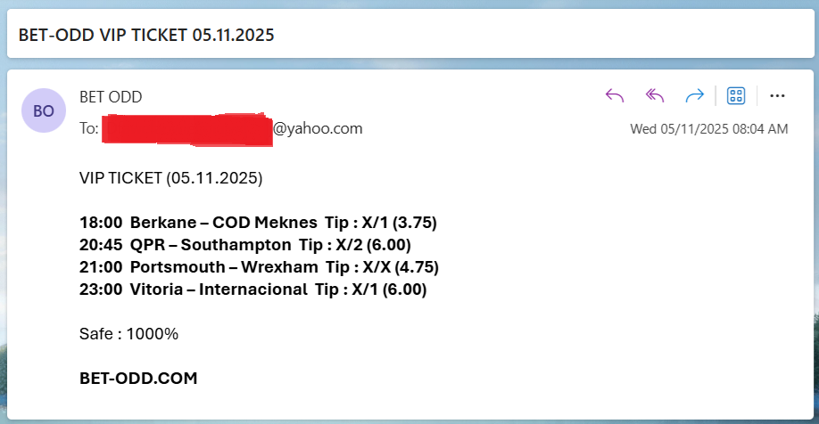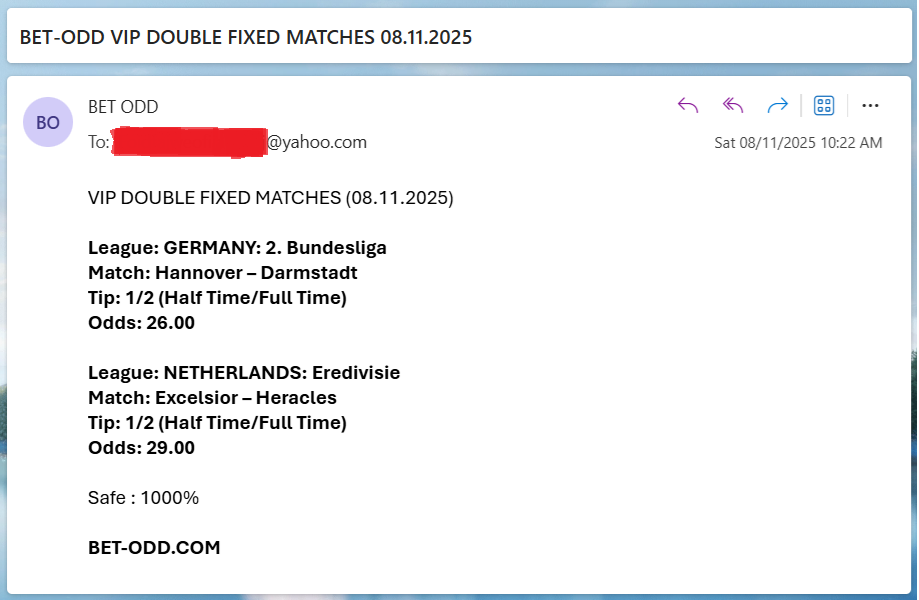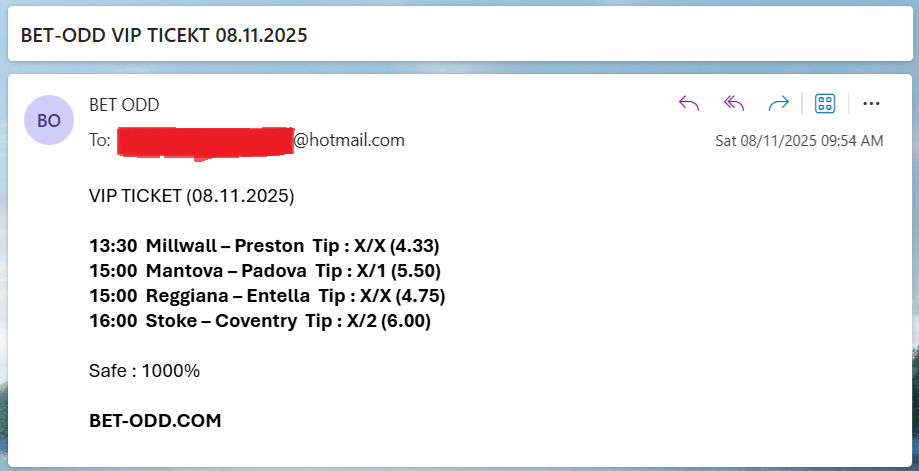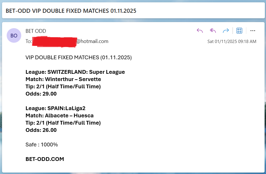 Welcome to the BET-ODD company, which offers you a real opportunity to earn money with fixed matches. We and our team are completely independent. We get information about fixed matches from: Football Clubs, Suspended Players, Injury Players, Financial Status in Clubs, Forms, Selling Players, Mutual Agreement Between Clubs, Strong Information. With us, fixed matches no chance to mistake. If you make a mistake, you get your money back or we give you the next fixed games for free. We guarantee your victory. We specialize in the gambling industry, which means we can offer our customers an exceptional and good earnings offer with our fixed matches.